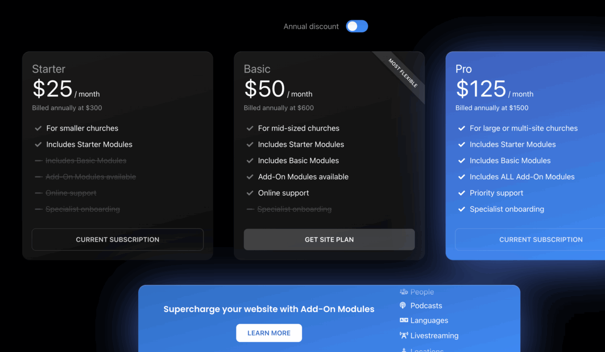 - Basic: Includes all Starter modules, plus Events, Giving, Groups, Imports, Ministries, Prayer, Sermons, Staff, Testimonies. Optional add-on modules (Language, Livestreaming, Locations, Newsletters, People, Podcasts) are available for additional subscription.