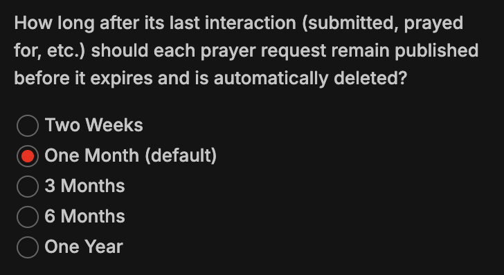 Prayer requests can be configured to expire automatically after a chosen number of days. Once expired, they’re removed from the public wall but remain accessible internally for staff review, data retention, or future follow-up.