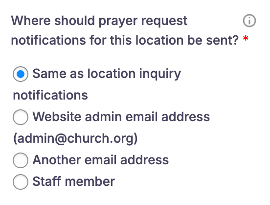 Multi-site churches can associate each prayer request with a specific campus or location. When a requester selects their location, the request is automatically grouped with that site, ensuring it reaches the leaders and teams responsible for caring for those individuals.