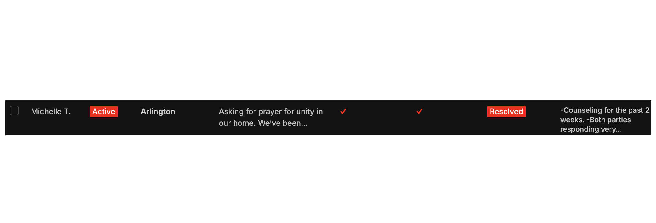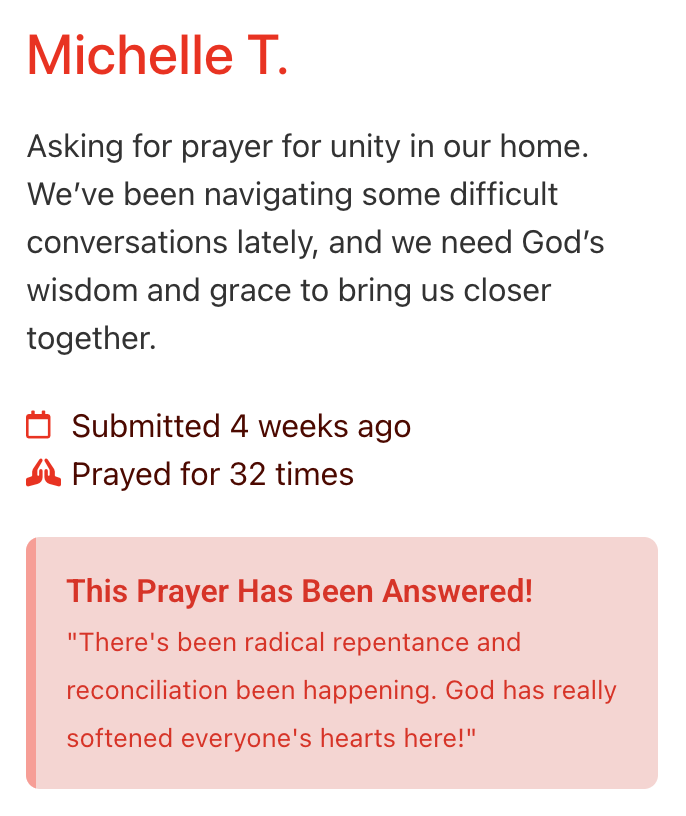 Each public request includes a prayer counter that increases whenever someone clicks to indicate they’ve prayed. It gives the church a simple way to engage and shows requesters that they are being supported.