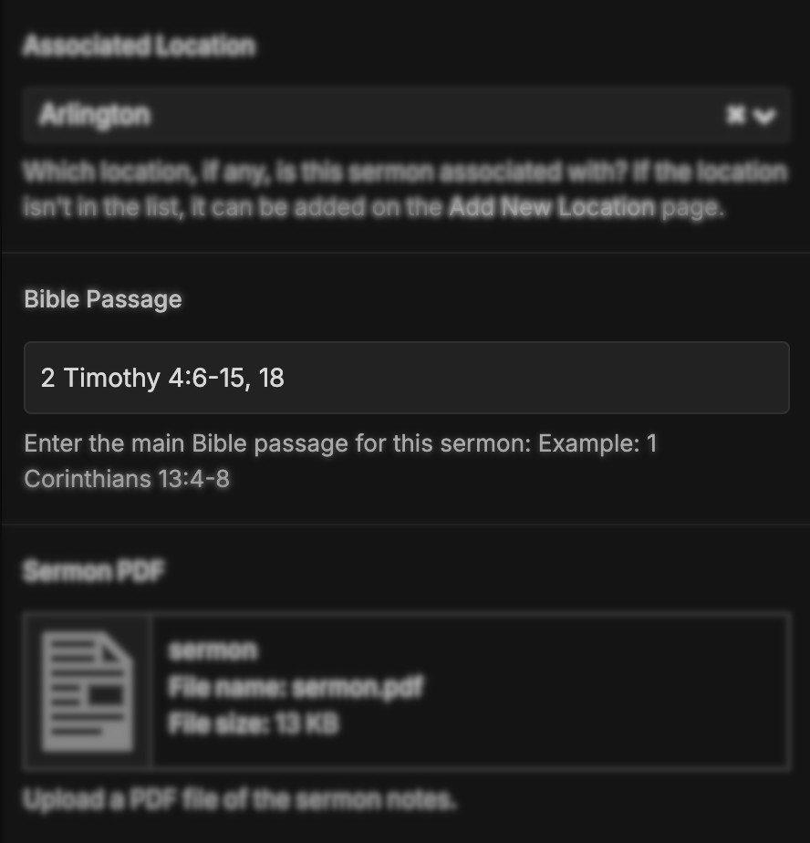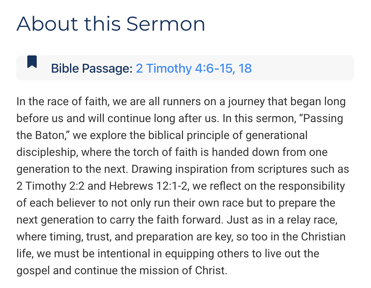 Every sermon includes dedicated fields for its primary Bible passage, allowing visitors to read or cross-reference Scripture directly alongside the message. Supporting passages and references can be included for deeper study.