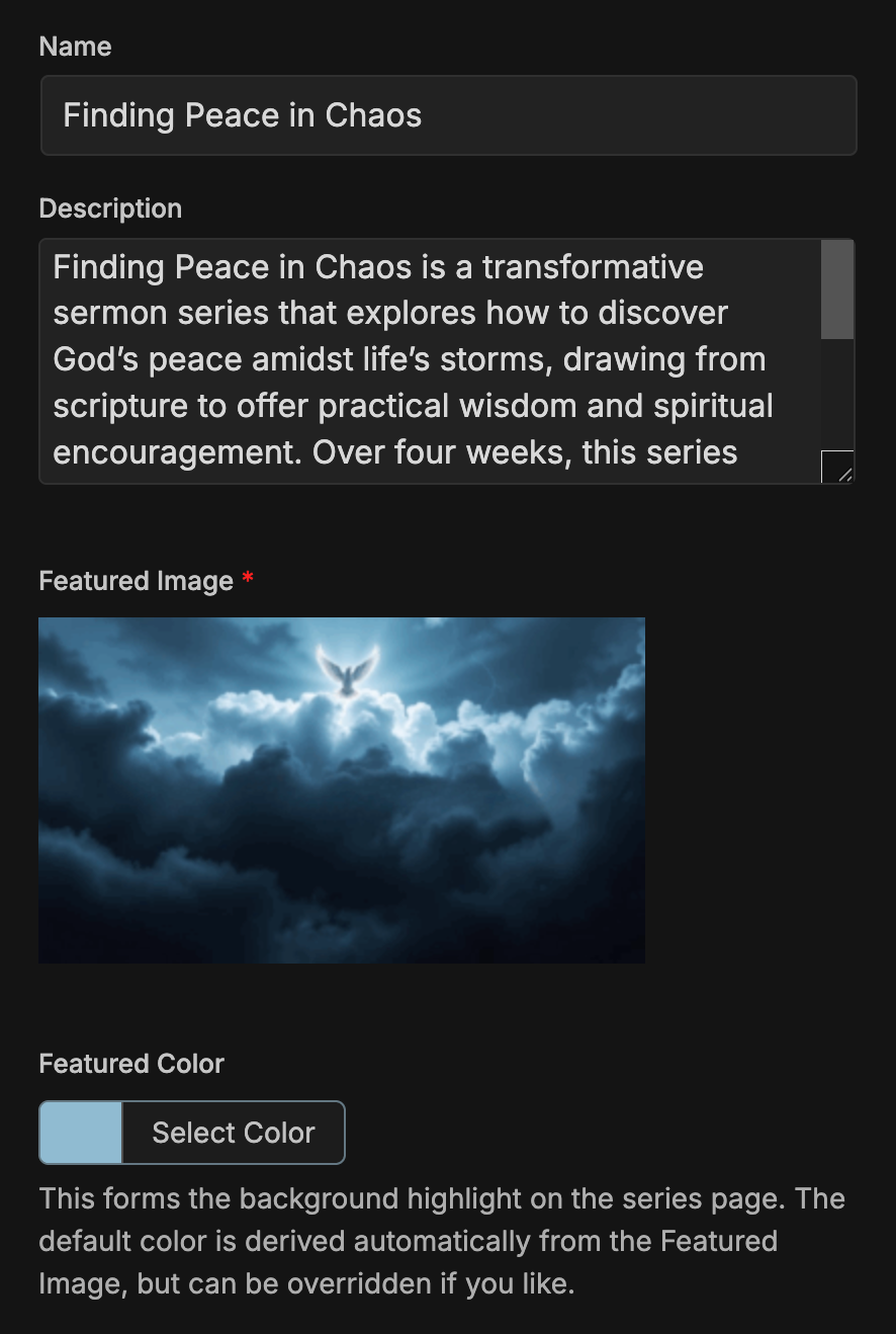 Sermons can be grouped into Sermon Series that let you organize messages by theme, book, or season. Each series has its own title, artwork, and description, helping visitors identify related teachings at a glance.