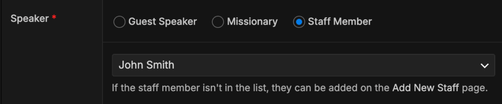 Because speaker information is shared across the site, it only needs to be entered once. That means consistent presentation everywhere and less redundant input when adding new sermons. Visitors can also view full speaker profile pages, which showcase each person’s bio, role, and every sermon they’ve shared.