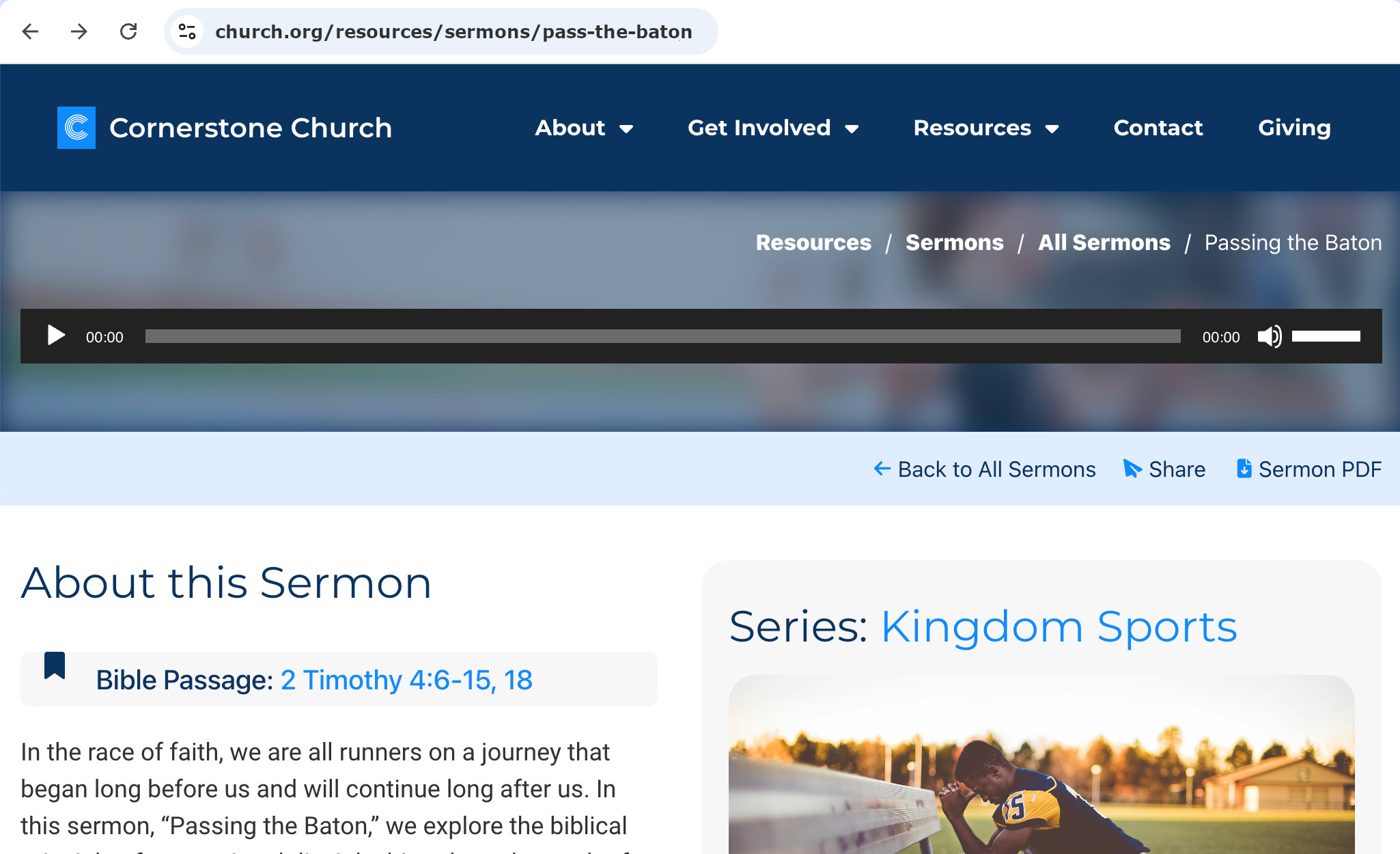 Downloadable study notes, outlines, or discussion guides can also be attached, allowing visitors to follow along or revisit the message later. Whether you’re posting full services or short devotionals, the Sermons module delivers them beautifully across every device.