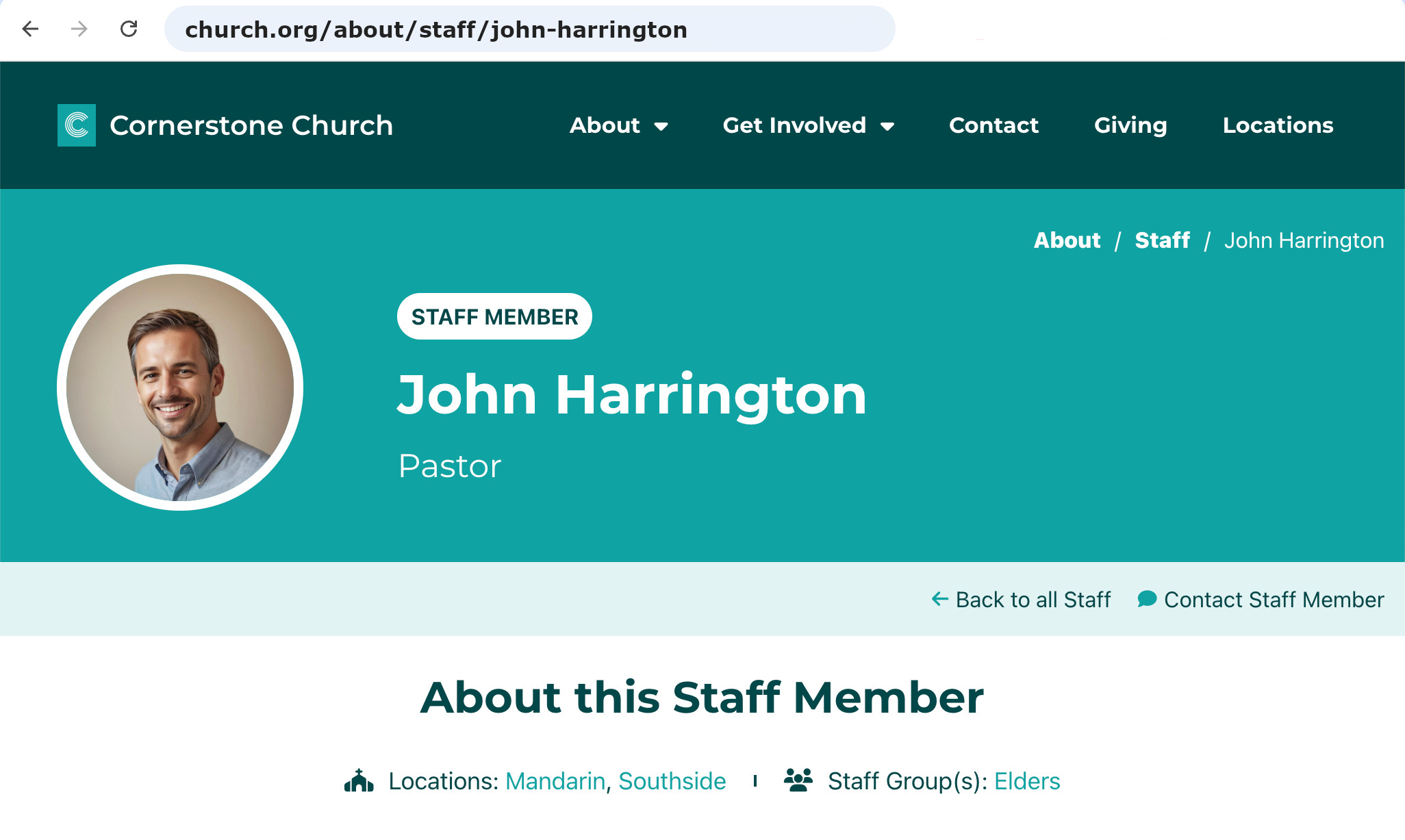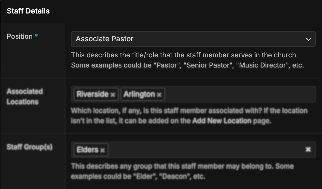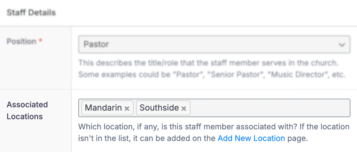For churches with multiple campuses, simply assign staff or volunteers to the locations they serve. Their profiles immediately appear on the correct campus pages, showing visitors exactly who leads and supports their location. No duplication, no juggling multiple versions of the same person—everything stays clean and centralized.