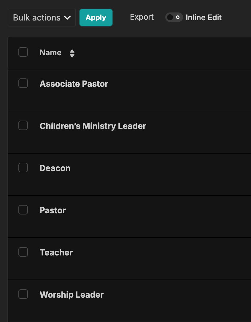 Titles like Pastor, Director, Coordinator, and Volunteer Leader are created once and consistently applied across every profile. There’s no need to type the same title repeatedly, and no risk of mismatched naming or accidental variations. Your terminology stays consistent across the board.